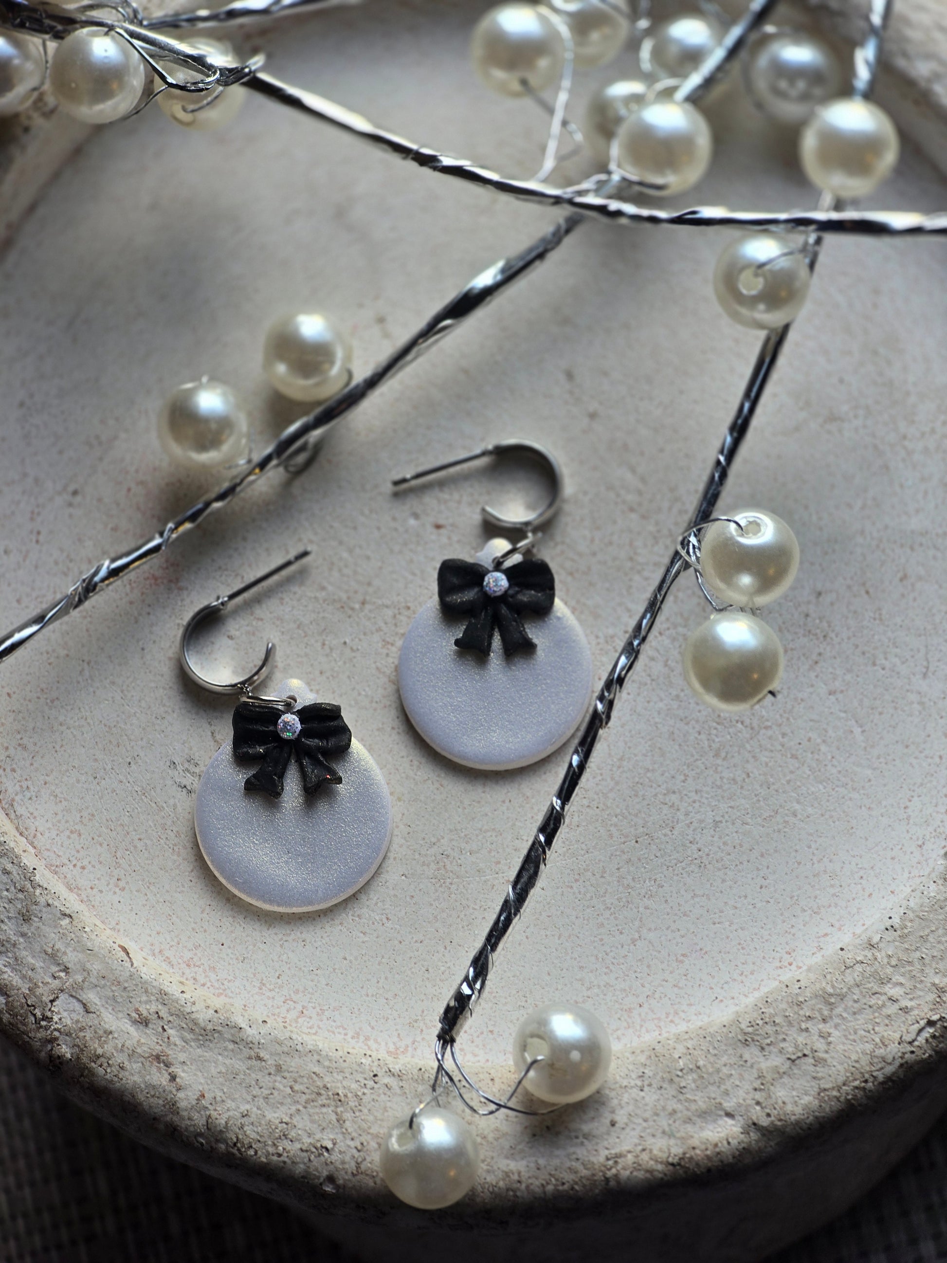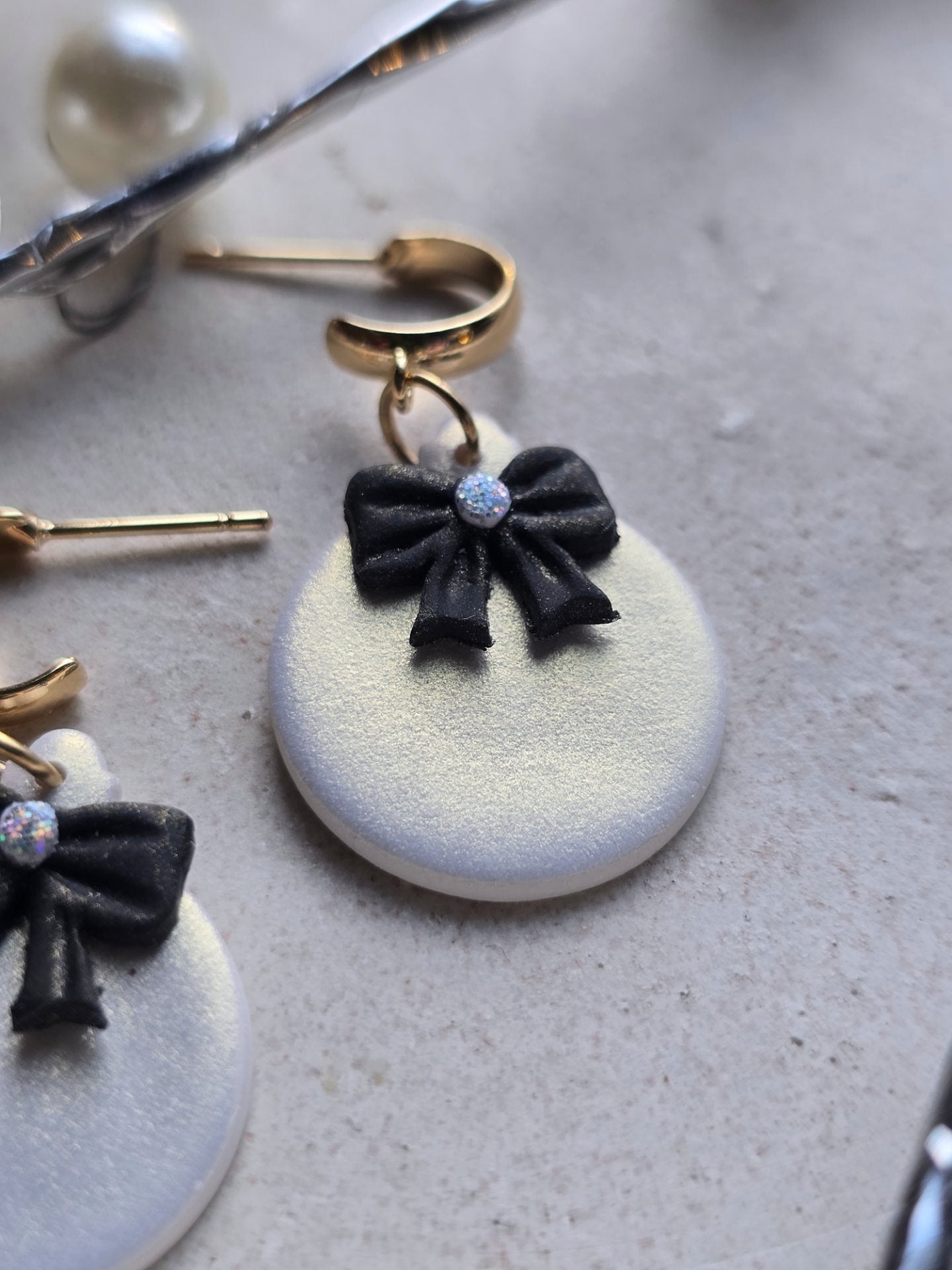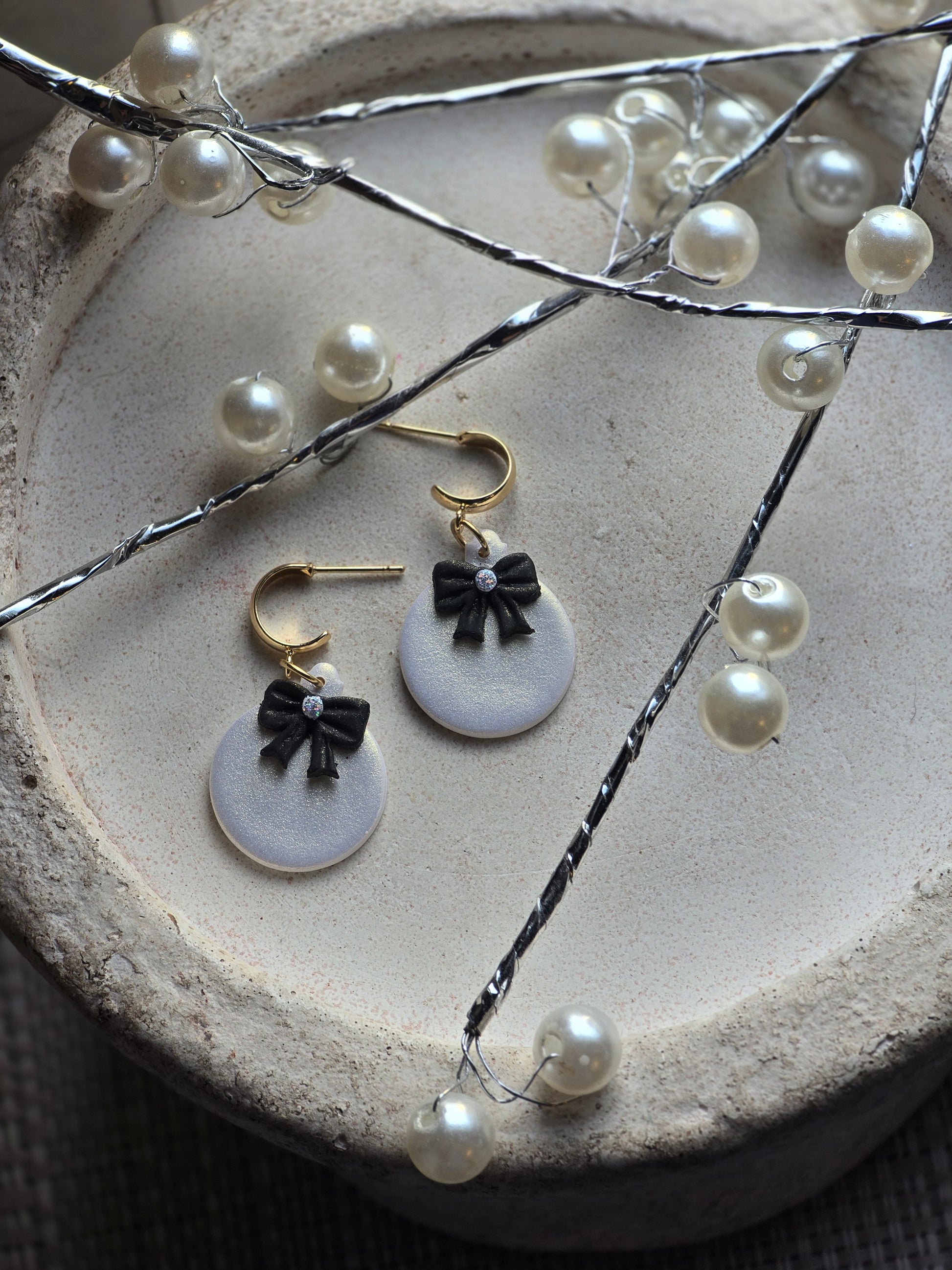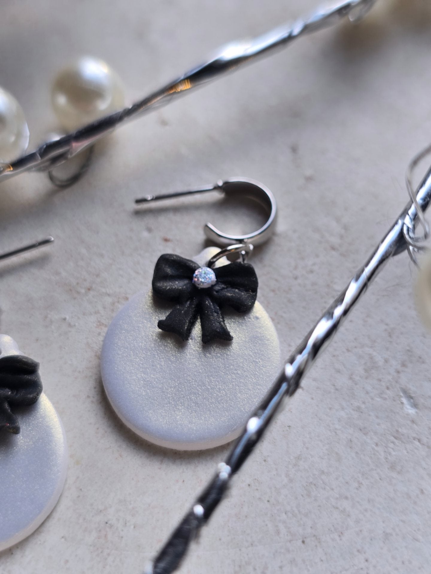 Add some sparkle to your holiday look with Bauble Huggies! These earrings feature a delicate shimmer and a beautiful black bow, making them the perfect accessory for your Christmas outfit. Upgrade your style and embrace the festive spirit with Bauble Huggies.