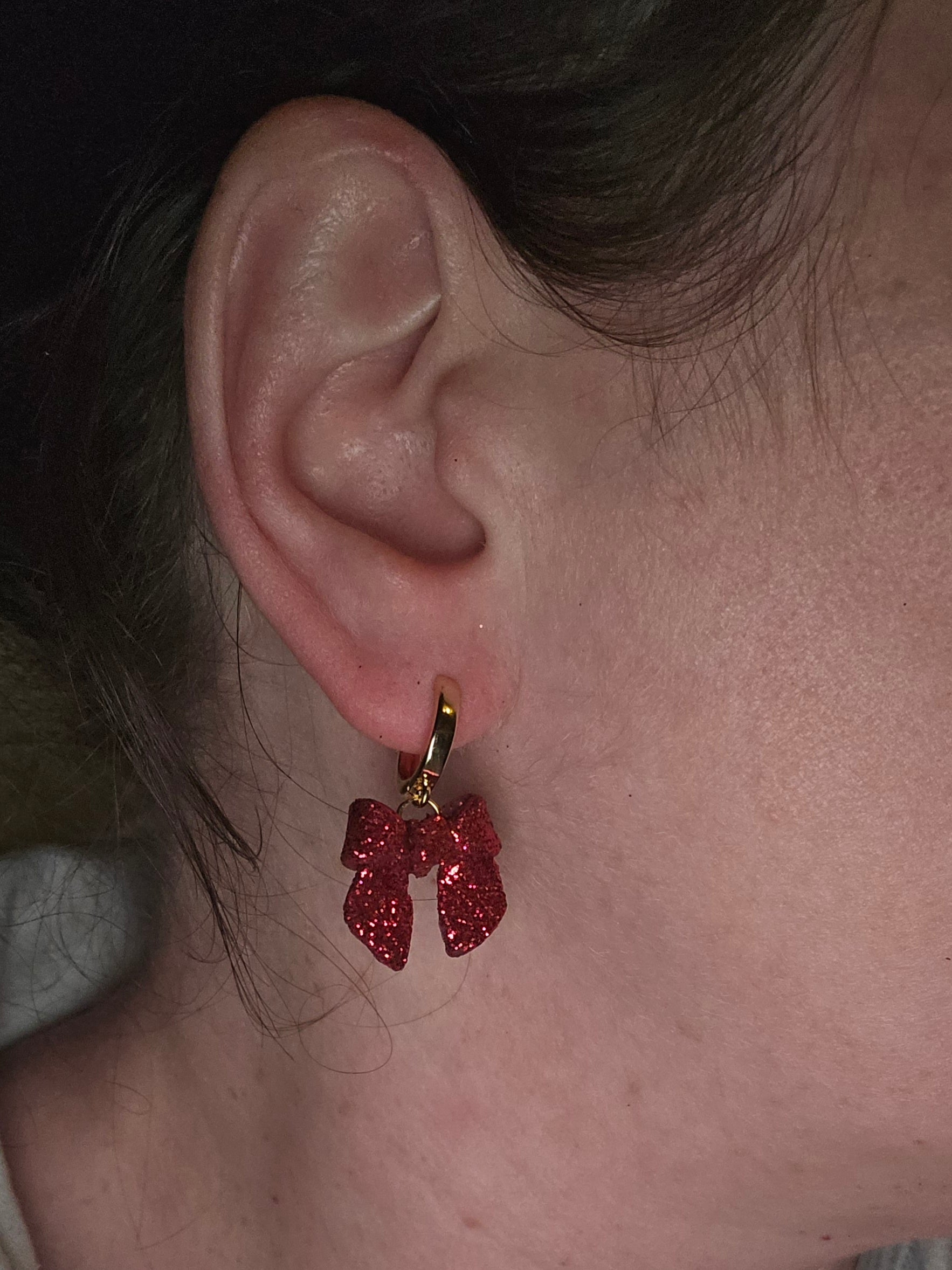 Add a pop of sparkle and charm to your holiday outfit with our Glitter Bow Huggies in red! These adorable earrings are also available in gold and silver, perfect for the winter season. Elevate your style and spread some festive cheer with these cute huggies.