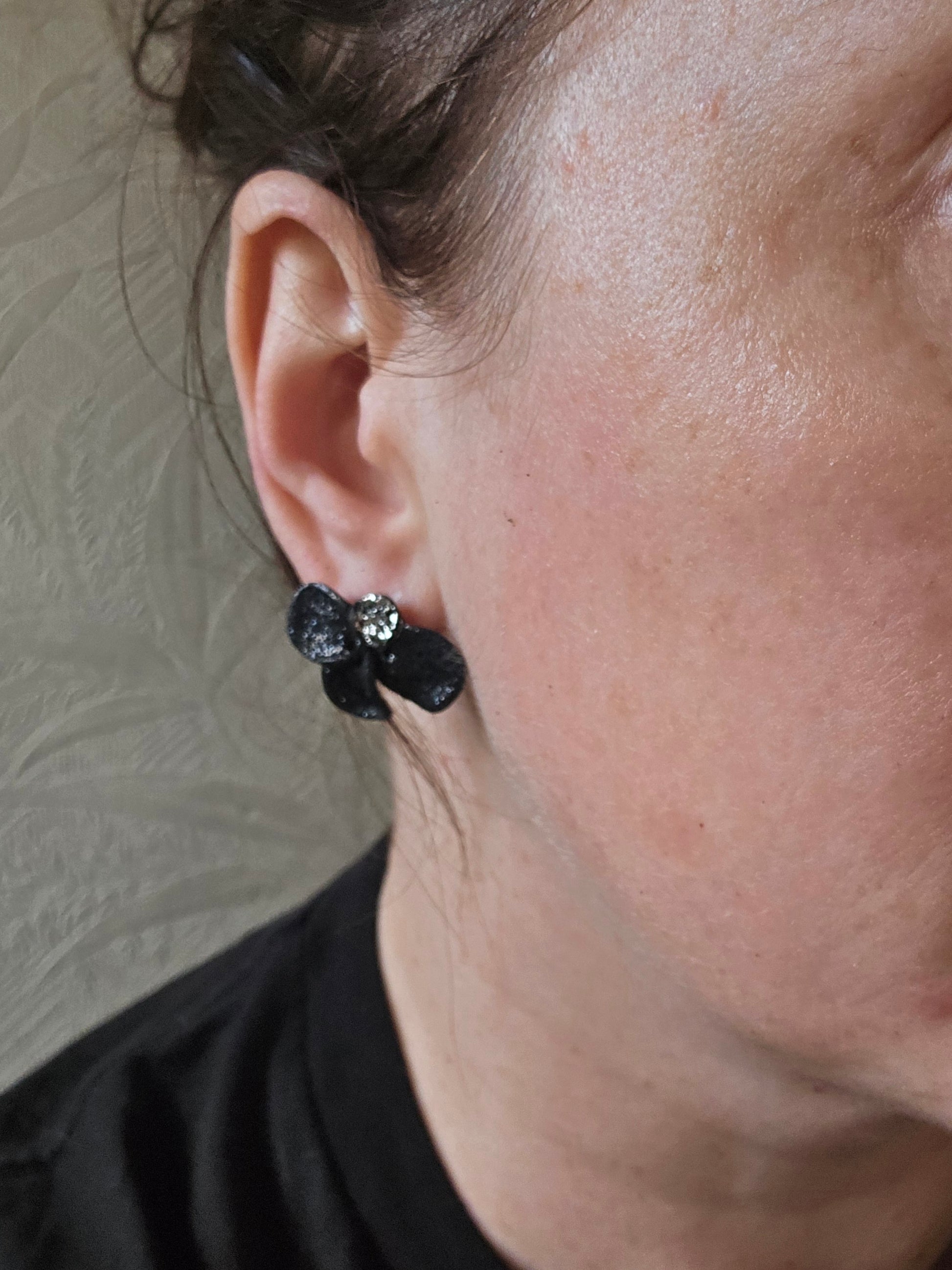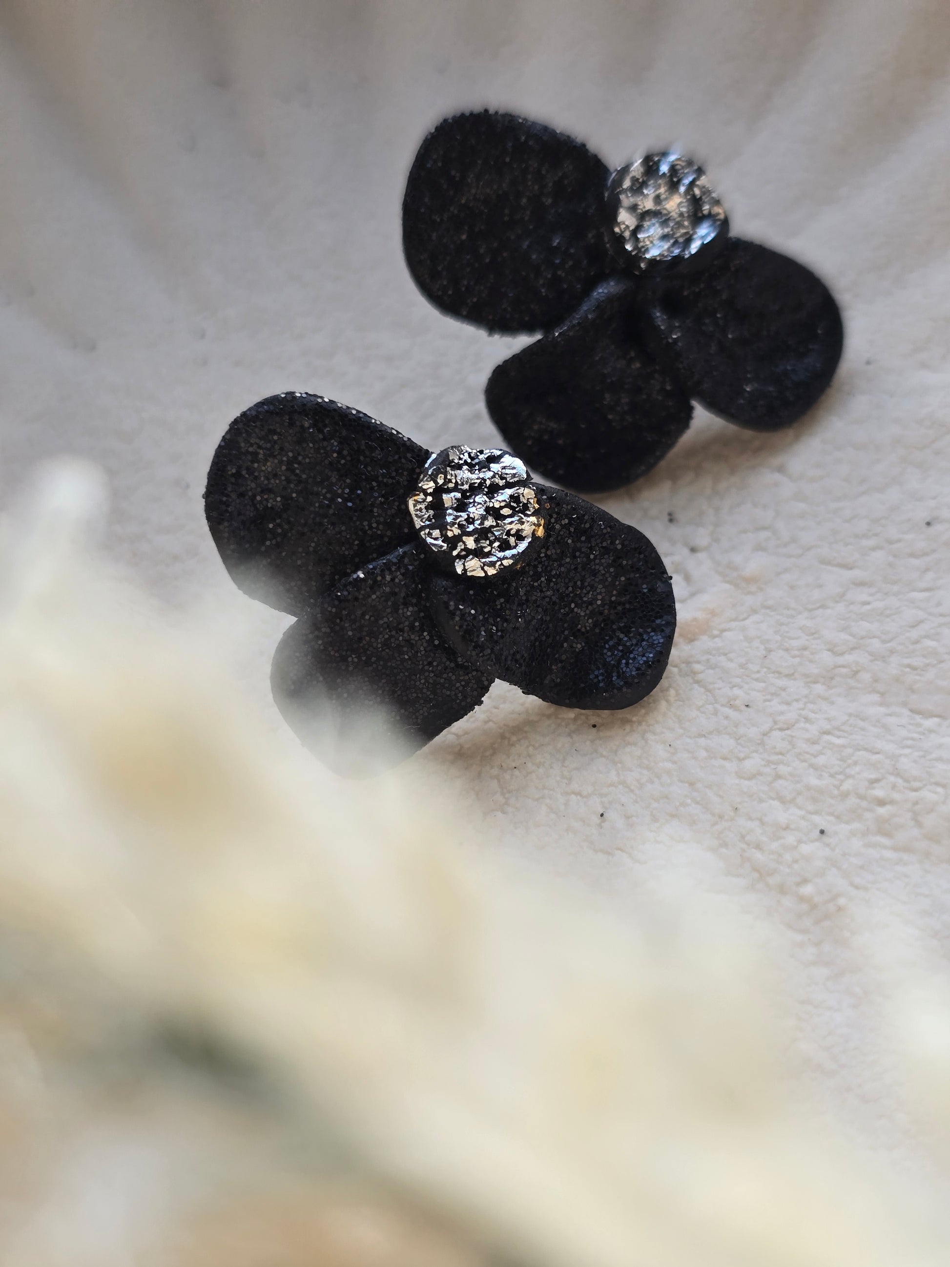 Add shimmer and sparkle to any outfit with our Glitter Flower studs. Featuring black glitter and gold and silver accents, these lightweight earrings are perfect for the festive season. Elevate your style and turn heads with these eye-catching accessories.