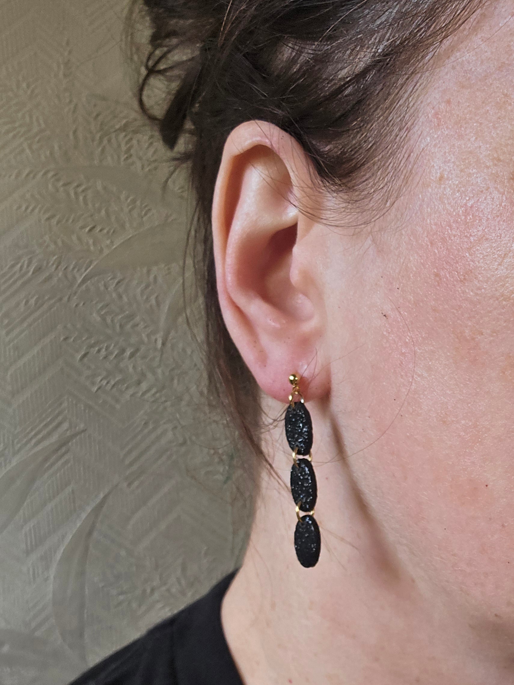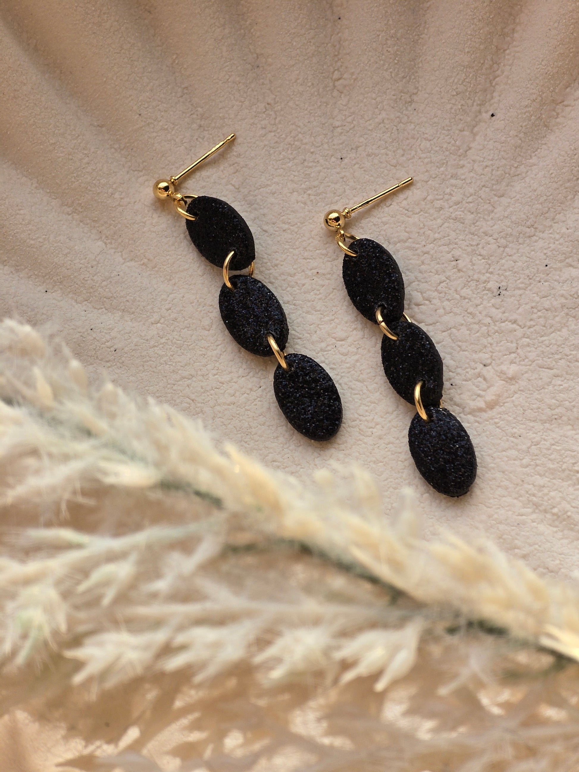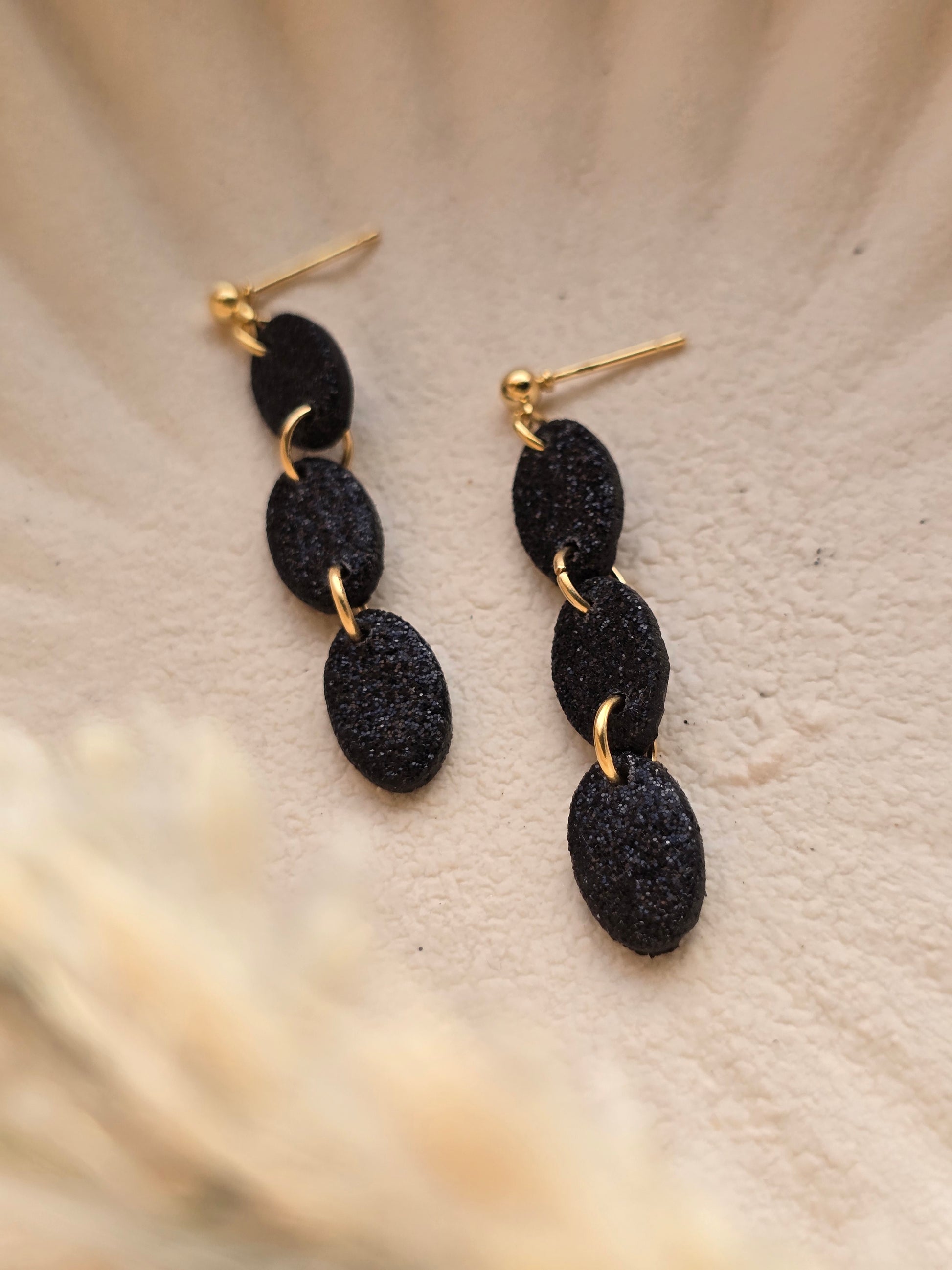 Welcome the festive season with our limited edition 'Sophie' dangle earrings in black glitter. These elegant earrings can also be switched for silver - just leave a note at checkout. Embrace the spirit of the season and elevate your style with 'Sophie'.
