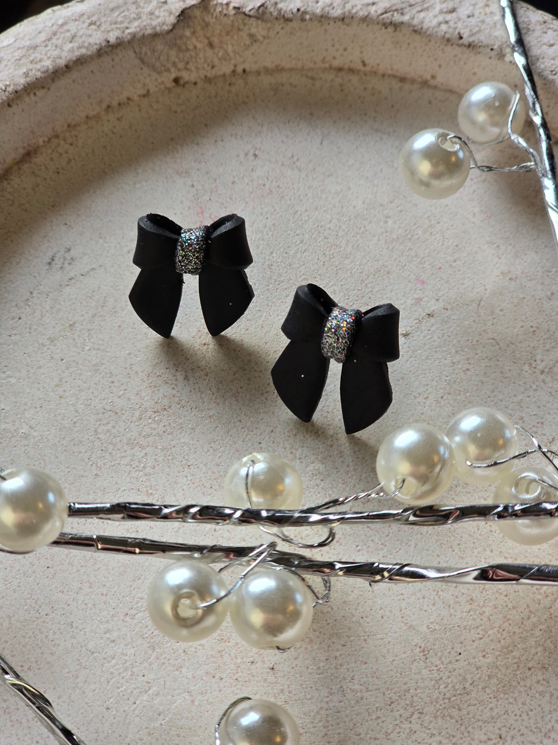 Add some sparkle to your New Year's outfit with these black bow studs featuring a glitter accent. These versatile earrings are the perfect accessory for any occasion, making you stand out with style. Upgrade your look with these trendy and elegant bow studs.
