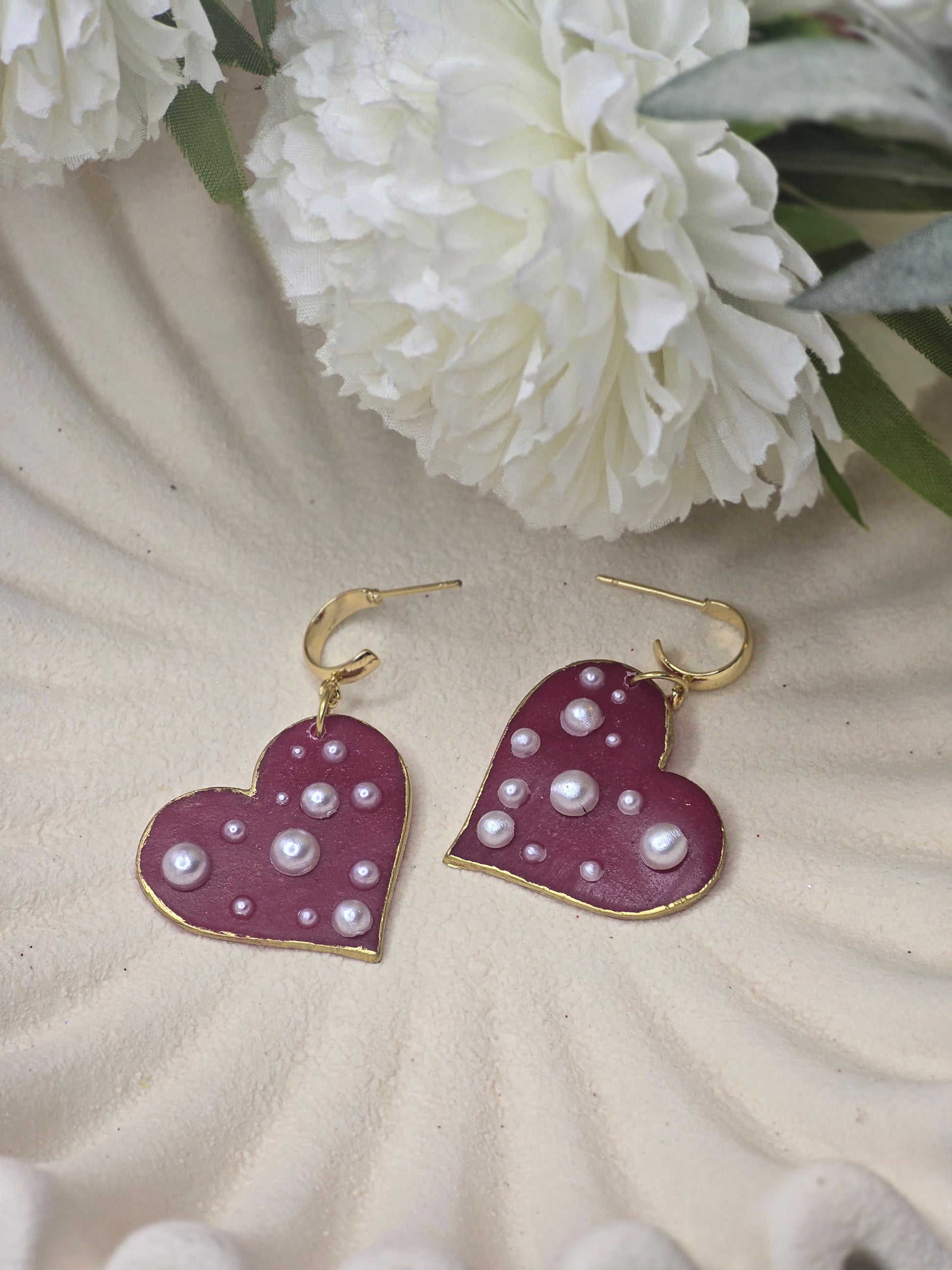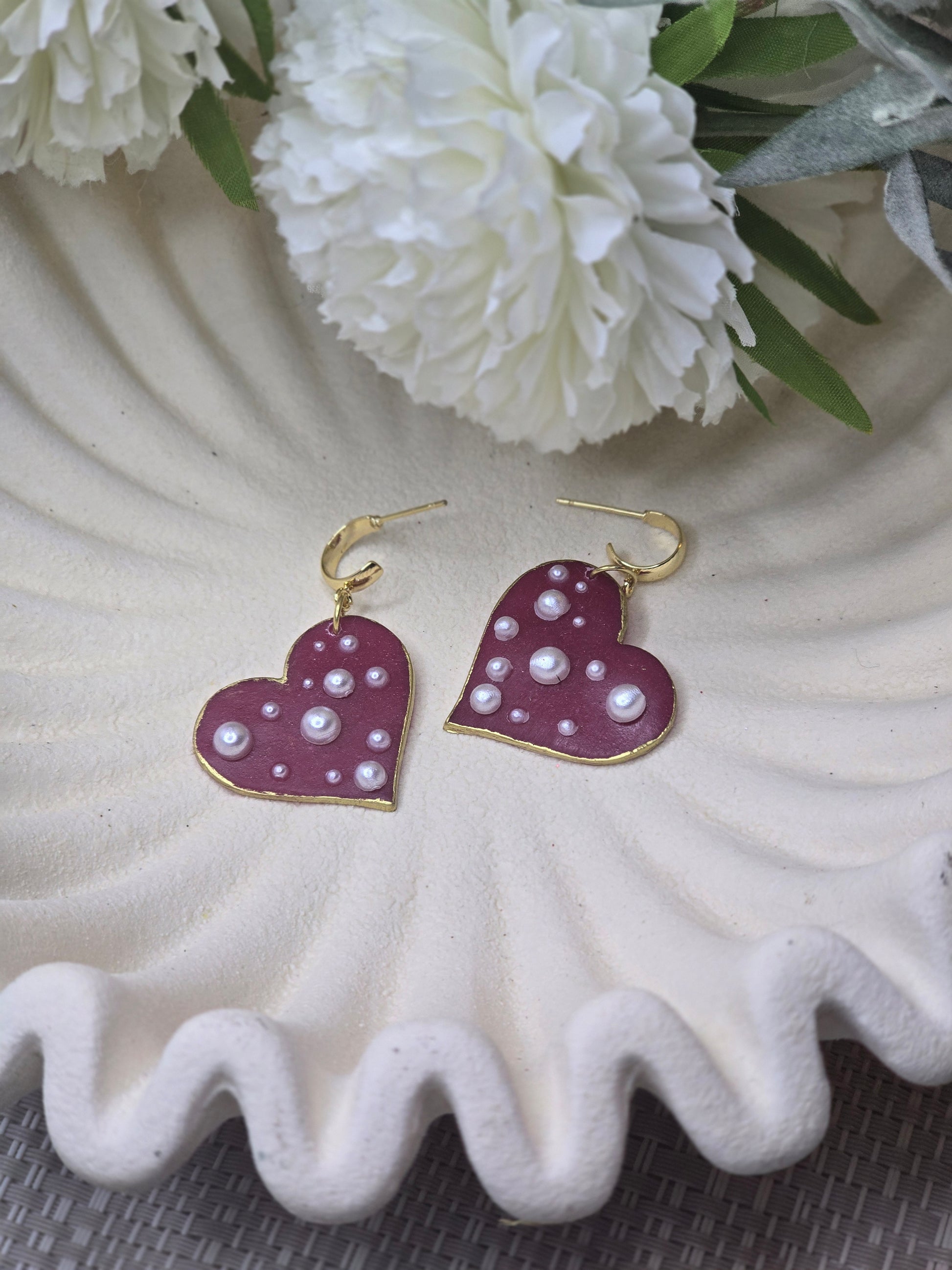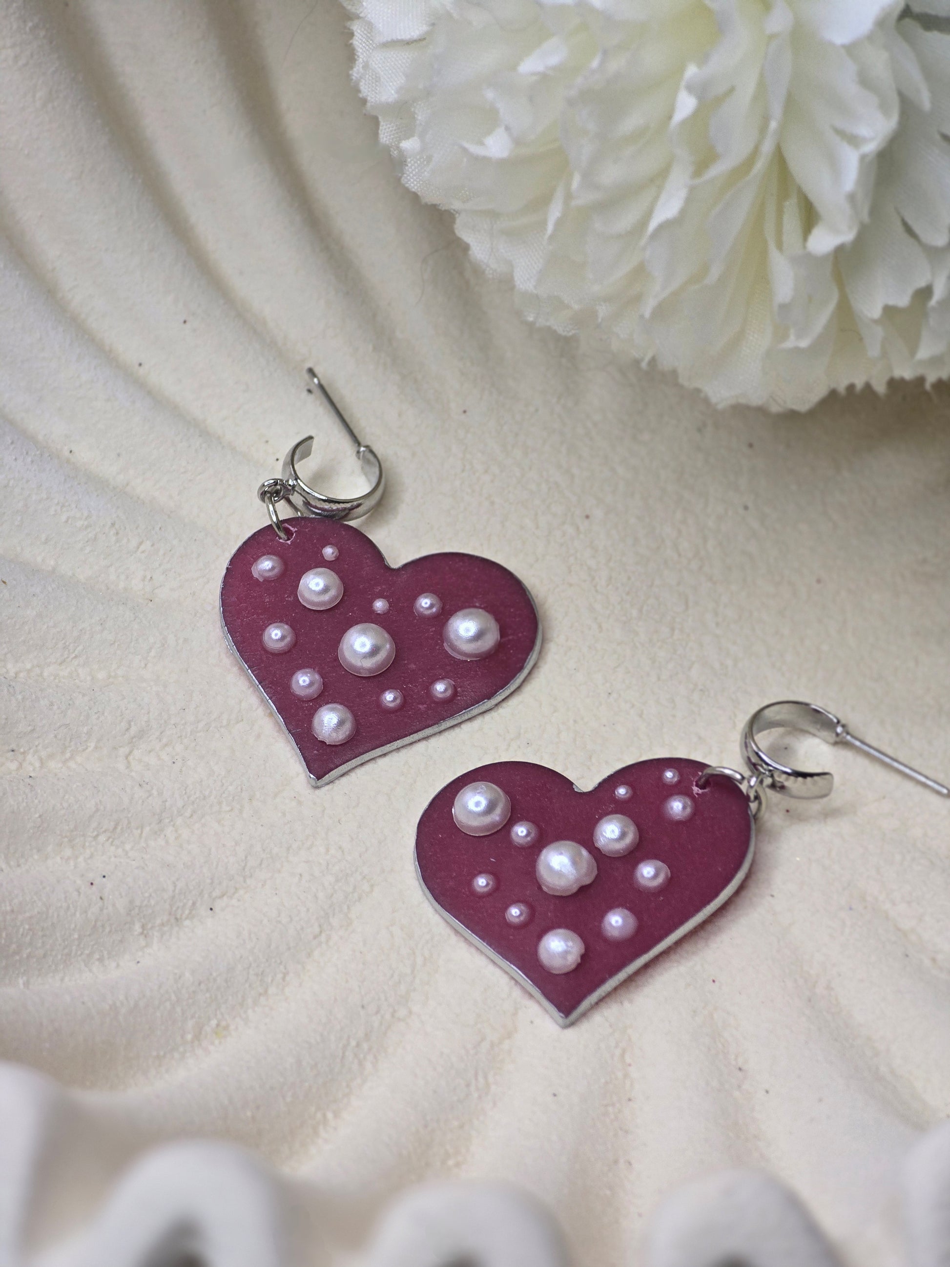 Add a touch of charm to your jewelry collection with these Pearl Heart Huggies. Adorned with lovely pearl beads on a vibrant red heart, they feature a sleek gold or silver trim. Crafted from polymer clay and plated with quality stainless steel, they’re both stylish and durable for everyday wear.